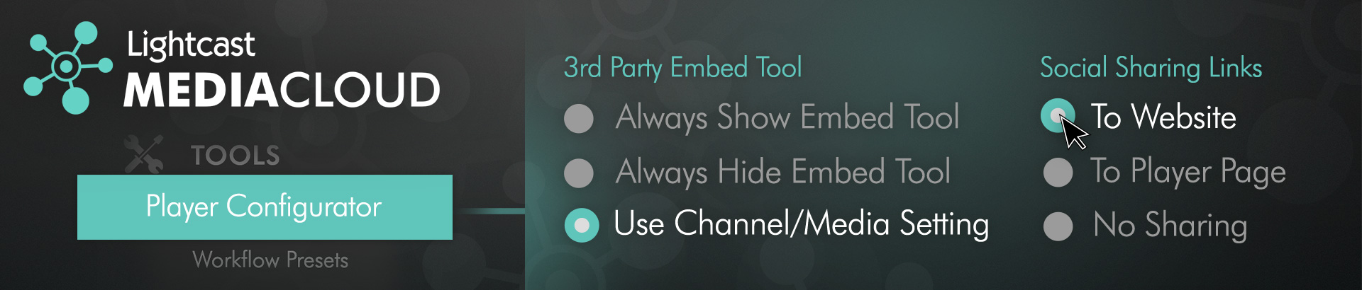 The Player Configurator under "Tools" in your Media Cloud account is getting richer and richer. The latest features we added to the Player Configurator are the Sharing and Embed Configurations.