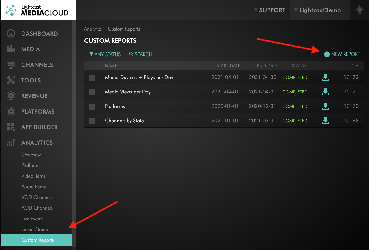 1. Under “Analytics” go to “Custom Reports” and generate a report by clicking on “New Report”.