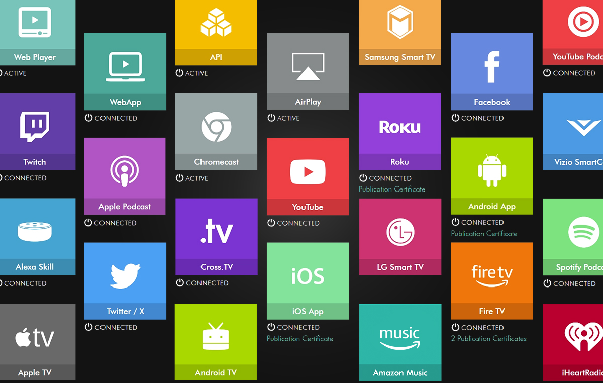 Distribute content seamlessly to websites, mobile devices, and TV platforms like Roku, Fire TV, Apple TV, Google TV, Samsung Smart TV, LG TV, Vizio, iOS, Android, Spotify, and more.
