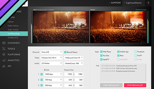 Define one of your Lightcast VOD Channels as the source for a linear stream which is auto-populated on our MEDIA CLOUD and loops endlessly. Create, update and change your playlist of VOD assets any given time. Read More.