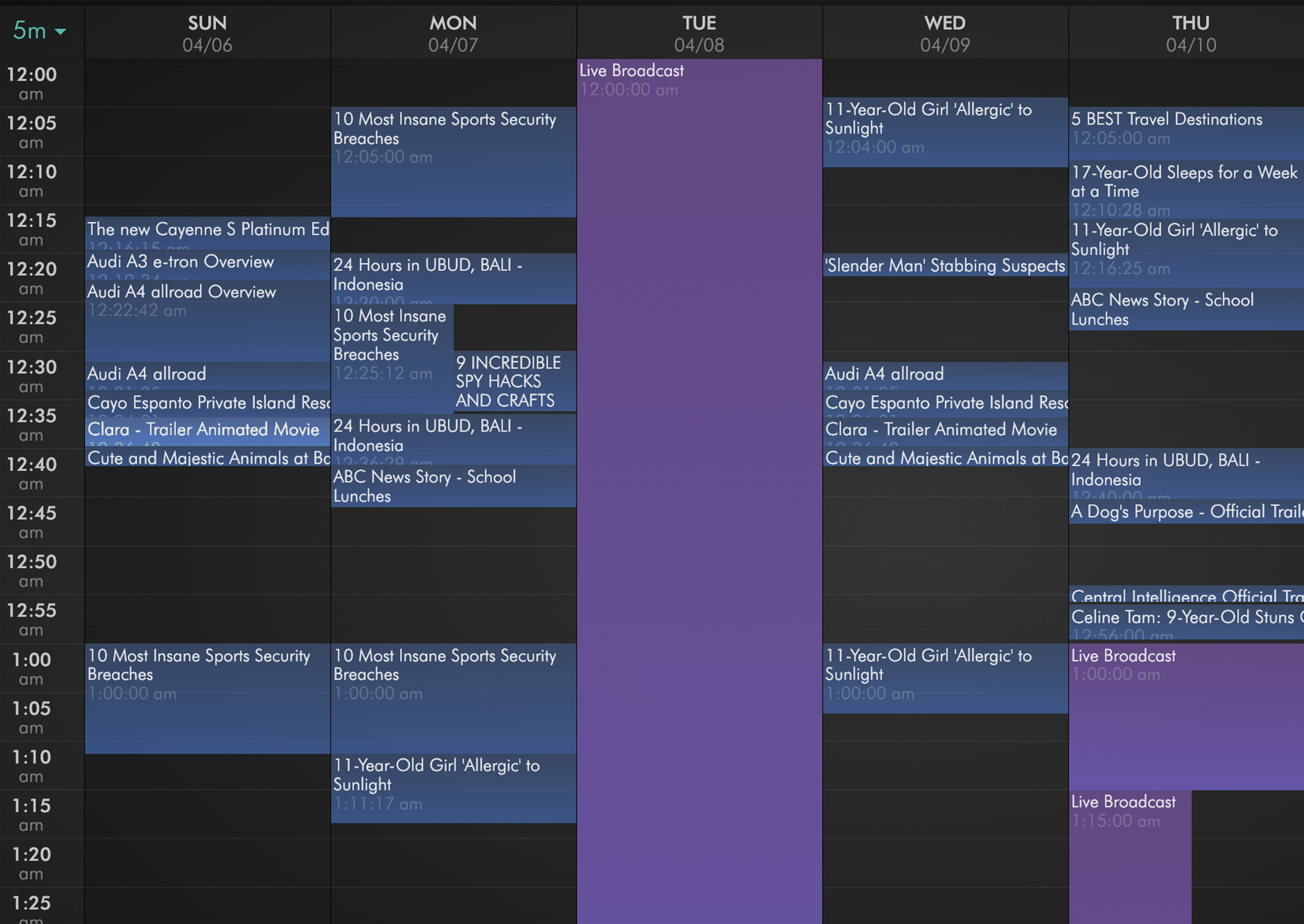 Use our cloud-based 24/7 scheduler to drag and drop your VOD assets into a schedule grid and create a scheduled linear 24/7 feed through our MEDIA CLOUD's playout system and integrate your linear stream on all your websites, mobile apps and TV apps. Create ad-breaks with your own commercials, or your sponsors, or have the engine auto-fill your ad-breaks gaps between scheduled TV Shows automatically with your defined filler videos.